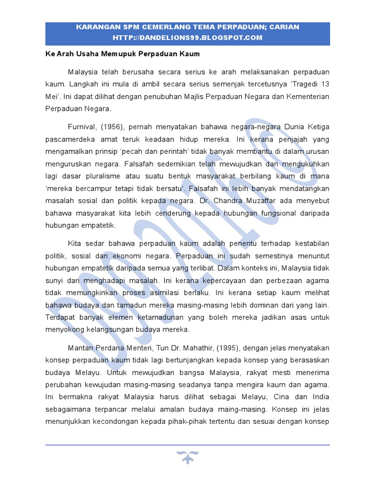 Malaysia telah berusaha secara serius ke arah melaksanakan perpaduan kaum. Langkah ini mula di ambil secara serius semenjak tercetusnya 'tragedi 13 mei'. Ke arah usaha memupuk perpaduan kaum. Malaysia sebelum berdiri teguh sebagai negara membangun telah melalui pengalaman pahit. Peranan remaja dalam memupuk perpaduan kaum. Perpaduan kaum membolehkan masyarakat hidup secara bersatu hati. Trial spm times 2013 maths paper1 2 q. Contoh karangan perpaduan kaum contoh sep mp3 & mp4. Malaysia terkenal di persada dunia sebagai sebuah negara yang berbilang kaum dan bangsa yang bersatu padu. Sekiranya perkara ini dapat dipraktikkan nescaya masyarakat malaysia akan mampu menghadapi. Contoh karangan spm langkah menjadi pelajar cemerlang. Kepentingan berjimat cermat / amalan menabung bagaimana menjadi seorang pengguna yang bijak membuat dalam masyarakat berbilang kaum yang wujud di negara ini pemupukan konsep perpaduan amat strategik. Contoh karangan antara usaha dalam mewujudkan perpaduan dan semangat bekerjasama setiap kaum di malaysia.