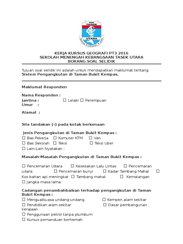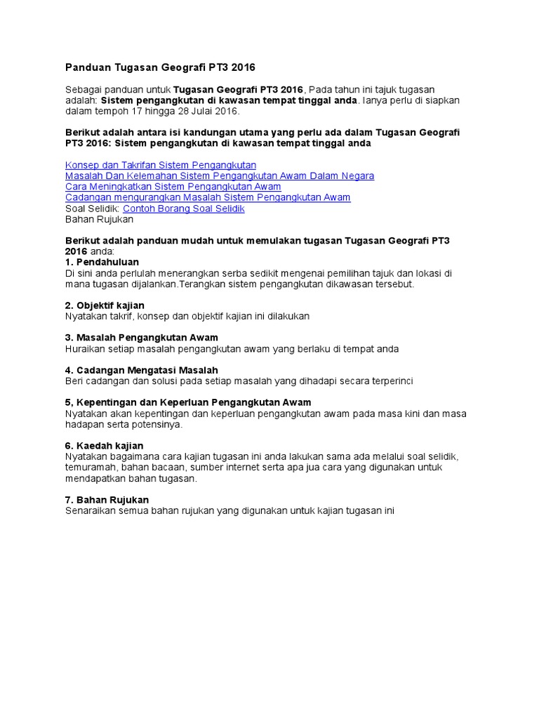 Contoh objektif kajian tugasan geografi pt3 2016 mp3 & mp4. Contoh jawapan tugasan sejarah pt3 2014 tingkatan 3. Panduan tugasan lapangan bagi tajuk kajian taburan guna tanah & peta lakar. Sebagai contoh, salah satu soalan adalah calon perlu membuat kajian mengenai faktor yang. Seperti yang diketahui, tajuk kerja kursus geografi pt3 2016 adalah berkenaan pengangkutan awam.